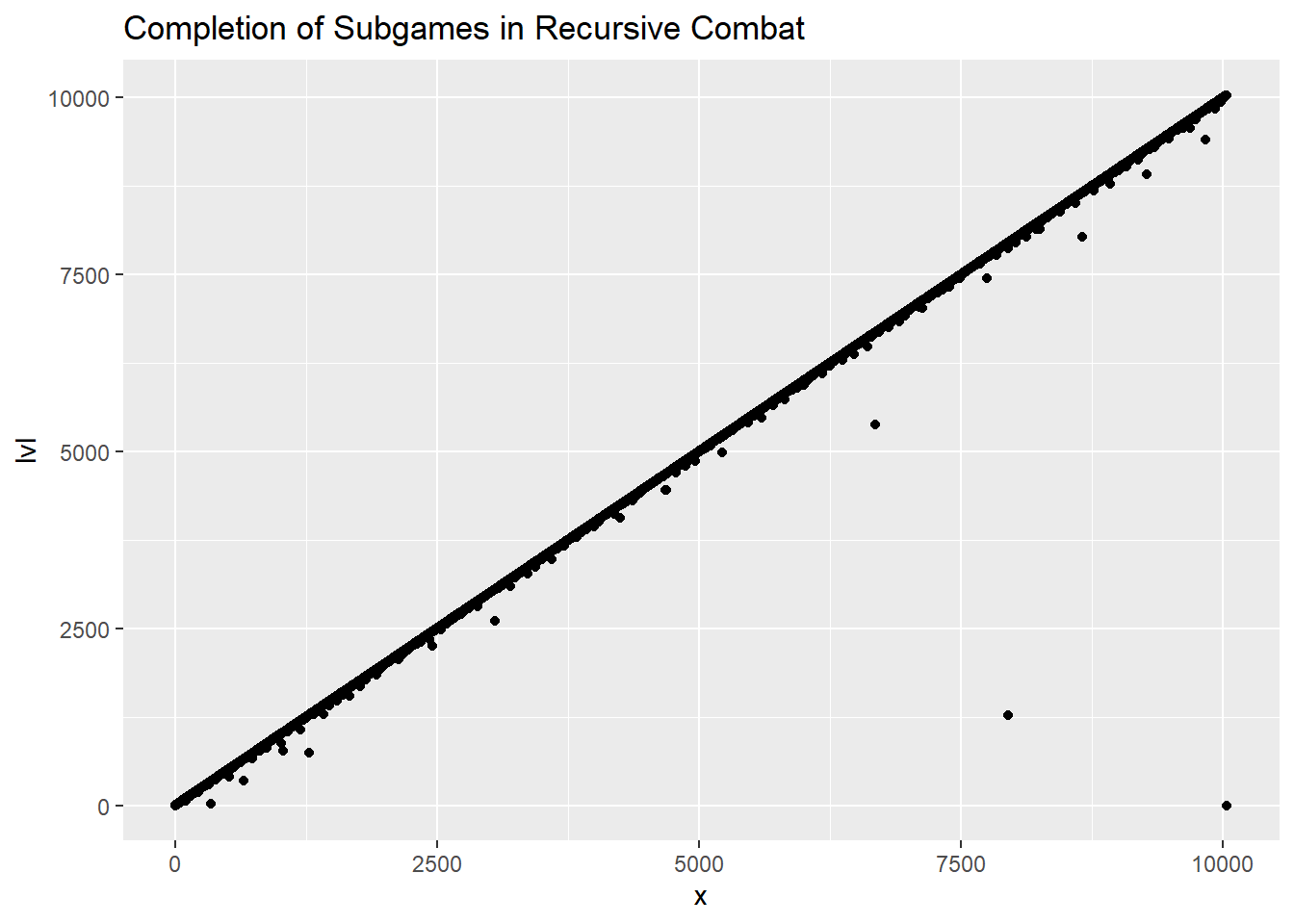 # plot the levelstibble(lvl = game_levels) %>%mutate(x =row_number()) %>%ggplot(aes(x, lvl)) +geom_point() +ggtitle("Completion of Subgames in Recursive Combat")